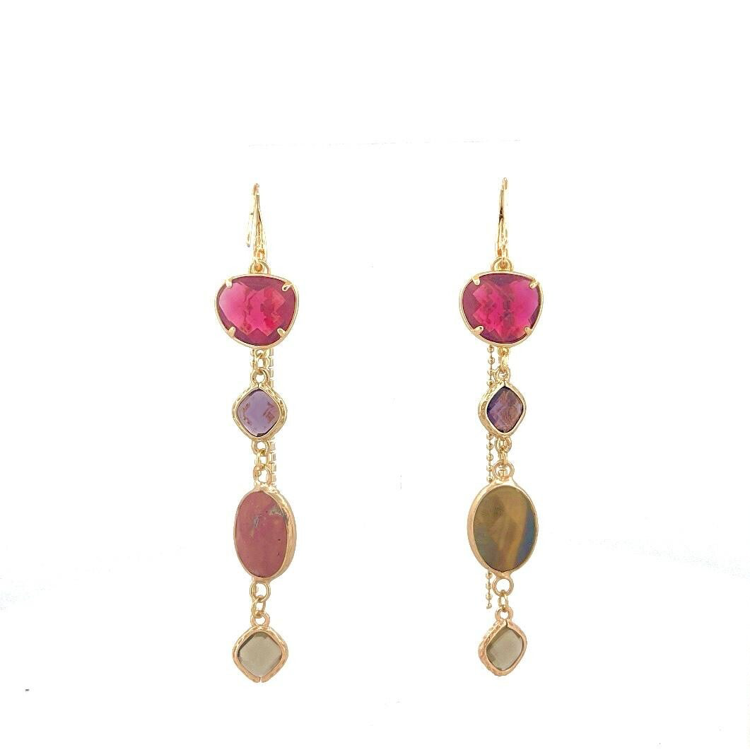Light up your look with the radiant spectrum cascade earrings. Featuring a striking sequence of jewel-toned accents - from deep ruby red to soft lilac and earthy neutrals - each stone is delicately framed in gold and connected by shimmering chains. The long, flowing design moves gracefully with every step, catching the light and adding a touch of sopistication to any outfit.