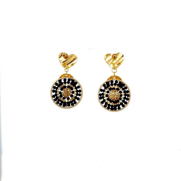 These striking earrings blend bold design with a touch of romance. The wavy gold heart studs lead to black-and-white patterned discs adorned with delicate golden charms - including a graceful bird and a filigree heart. Together, they create a look that's both timeless and full of personality.